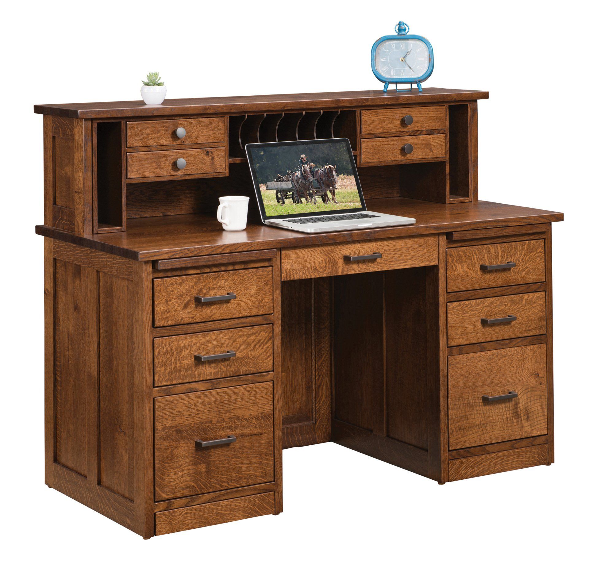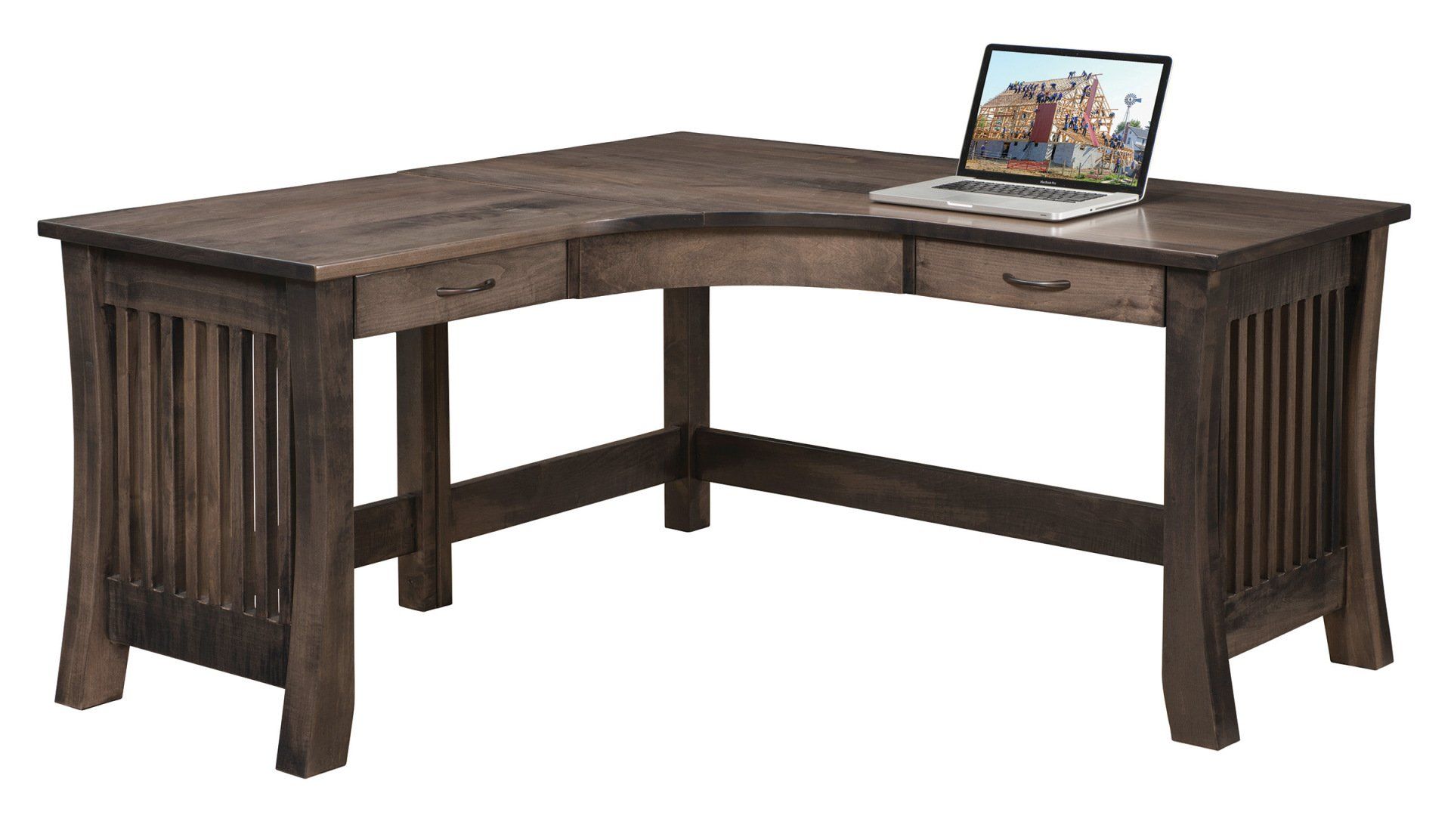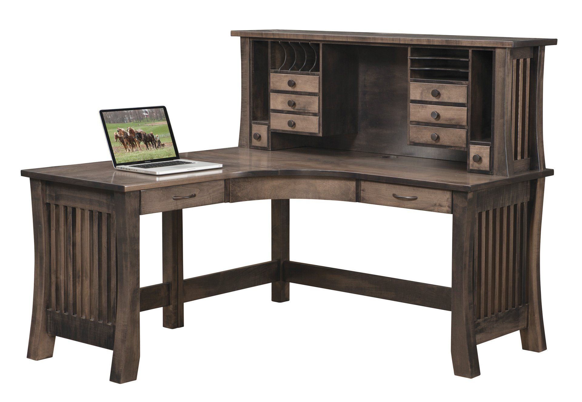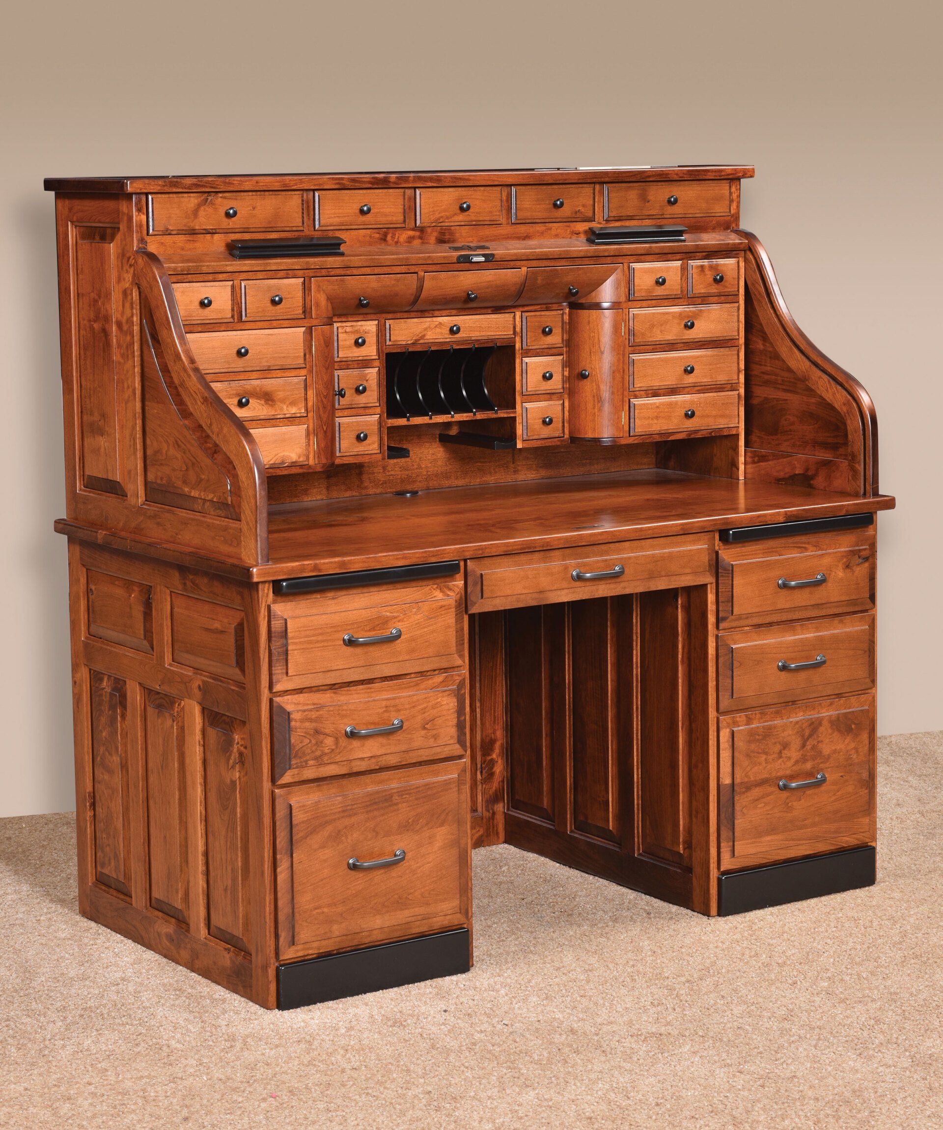 Here is just a small sampling of the Amish made office furniture we can provide. We have several Amish builders who specialize in building office furniture and each builder has a catalog of beautiful collections. Once you pick a style you then pick the wood species, the stain color, and the hardware for the drawer pulls. There are dozens of stain choices from natural to very dark. We sometimes have a limited number office furniture pieces in our warehouse available for immediate delivery. FREE delivery on most items out to 30 miles from our store.